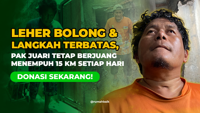 Sendirian, berjalan kaki 15 km setiap hari, dan bicara lewat leher yang bolong. Pak Juari umur 48 tahun tak menyerah walau hidupnya penuh ujian. Ia pernah mengalami kecelakaan berat yang membuatnya koma lama, hingga menyisakan lubang permanen di lehernya. Kini, untuk berbicara, ia harus menutup lubang itu dengan tangan. Bahkan dulu, saat minum, air bisa keluar dari lubang di lehernya.