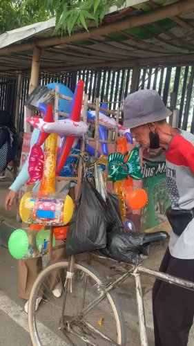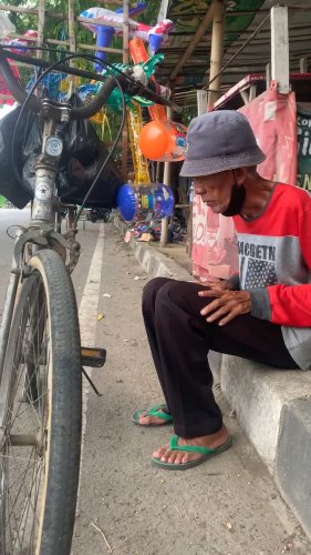 Setiap hari, Abah Rasidi berkeliling kampung dengan sepeda tuanya menjajakan mainan. Usianya sudah renta, tangannya bergetar, langkahnya tertatih, tapi ia tetap berusaha mencari nafkah demi istri dan dua anaknya yang masih sekolah.