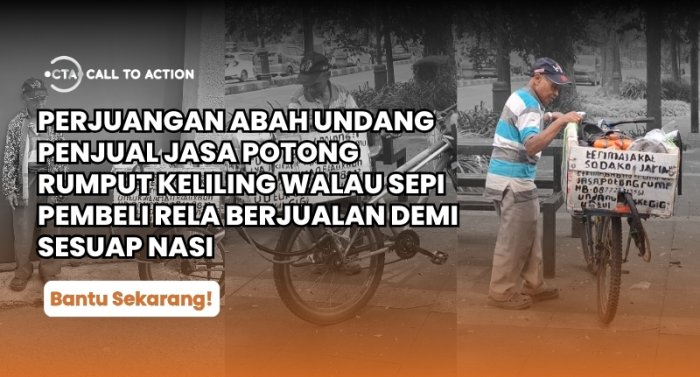 Lansia 60 tahun ini hidup sebatang kara, tanpa keluarga yang menemani, harus berjuang sendirian di jalanan demi bisa makan. Usaha jasa potong rumput yang ia jalani sudah hampir berbulan-bulan sepi, membuatnya sering tak makan berhari-hari dan hanya meneguk air untuk mengganjal perut.