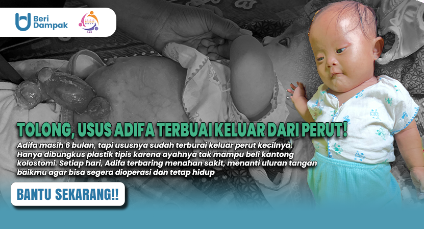 Adifa harus segera di operasi,untuk mengembalikan kondisinya seperti anak-anak yang lainnya. Usus yang terburai hanya bisa ditutup plastik seadanya,karena tidak mampu membeli kantong kolostomi yang biasa dipakai. "Jangankan untuk berobat untuk makan saja susah,belum kebutuhan adifa yang lainnya seperti popok,susu,dll harus darimana karena saya sering tidak mendapat orderan." - Ayah adifa