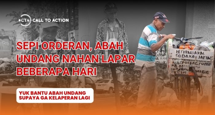 Lansia 60 tahun ini hidup sebatang kara, tanpa keluarga yang menemani, harus berjuang sendirian di jalanan demi bisa makan. Usaha jasa potong rumput yang ia jalani sudah hampir berbulan-bulan sepi, membuatnya sering tak makan berhari-hari dan hanya meneguk air untuk mengganjal perut.