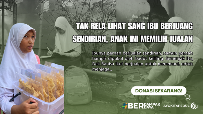 Tak hanya lelah, Ranisa juga harus menghadapi perlakuan yang menyakitkan. Ia pernah dijaili, kerudungnya ditarik hingga dagangannya jatuh dan hancur. Adiknya pun pernah diusir dan hampir disakiti saat ikut berjualan. Namun Ranisa tetap bertahan, menahan tangis, demi membantu orang tuanya.
