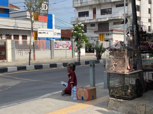 Pak Ivan (48 th) masih berjualan keliling berpuluh kilometer. Tubuh rentanya yang seringkali gemetar dipaksa untuk berjuang mencari nafkah. Beliau menjajakan air mineral demi untung 500 rupiah.