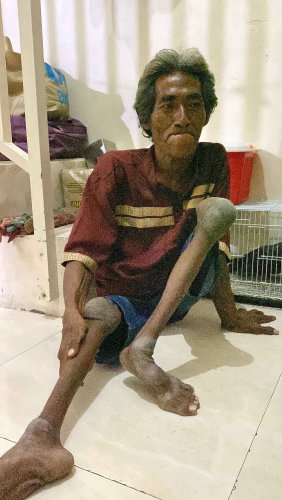 “Sekarang begini keadaan saya mbak, kaki saya tidak bisa diluruskan sakit tangan kiri saya juga tidak bisa diangkat”.-imbuhnya sambil berlinang air mata