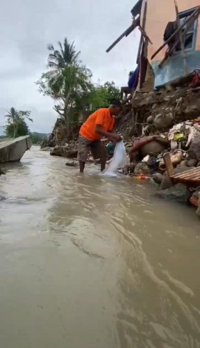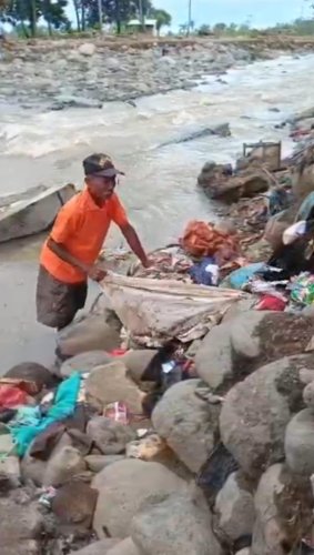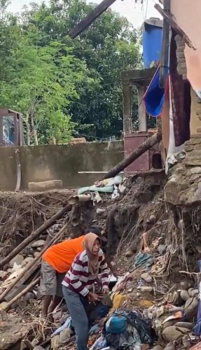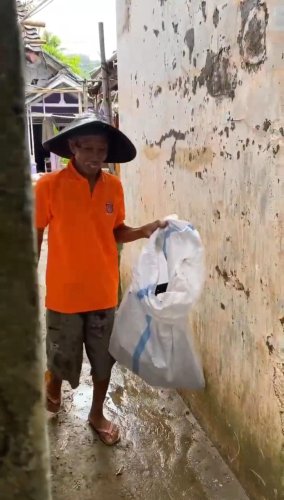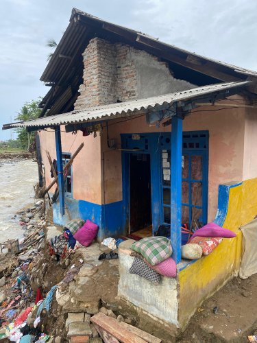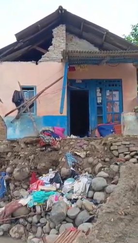 Rumah yang telah ia dirikan dengan jerih payah selama 13 tahun, kini runtuh. Dindingnya jebol, perabotan hanyut, dan kamar mandi hancur. Semua hasil kerja kerasnya hilang seketika dibawa banjir.