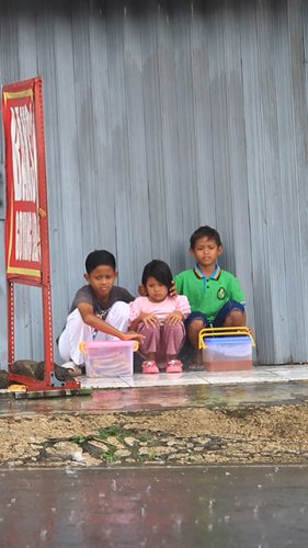 Saat aku bertanya kepada mereka, ternyata mereka tengah menjajakan dagangannya dan terpaksa berteduh karena hujan deras. Riski (14) merupakan anak tertua diantara mereka bertiga. Ia terpaksa berjualan bersama kedua adiknya Ridka (11) dan Salsa (7). Ketika aku coba bertanya lebih jauh, jawaban anak ini sungguh membuatku terpukul. “Jualan buat bantu ibu, karena ibu sedang sakit. Ayah saya sudah gak ada (meninggal)" Terang Riski.