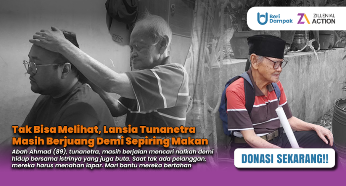 Abah dan Mak Acah sebenarnya sangat ingin memiliki pekerjaan lain seperti orang lain pada umumnya. Namun, kondisi mereka sebagai tuna netra membatasi kesempatan tersebut. Perusahaan-perusahaan tidak mau menerima mereka, dan mobilitas mereka sangat terbatas. Meskipun demikian, semangat Abah dan Mak tidak pernah pudar. Mereka tetap berusaha menjadi tukang pijat dengan sisa tenaga yang dimiliki. Mari sisihkan harta yang kita miliki untuk menciptakan kebahagiaan untuk abah Ahmad dan istrinya.