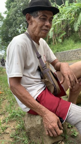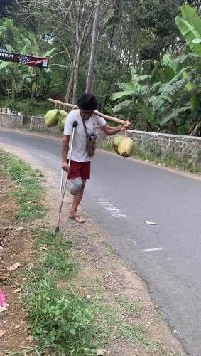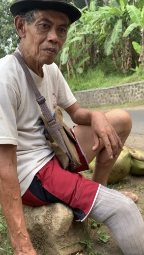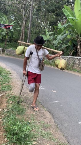 Abah Suyud berusaha mengangkat pikulan kelapa ke pundaknya dengan satu tangan, satu kaki, dan tongkat yang terus bergoyang menahan beban tubuhnya. Kaki kanannya diamputasi, tetap memaksa berdiri demi bisa menjual kelapa. Gerakannya pelan, nafasnya pendek, tapi matanya tegas… seolah bilang, “Selama bisa bergerak, saya akan tetap berjuang.”
