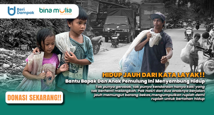 Setiap pagi, Pak Hasri bersama kedua anaknya berjalan kaki menyusuri jalanan kota, mengumpulkan barang bekas seperti kardus, botol, dan kaleng yang bisa dijual ke pengepul.