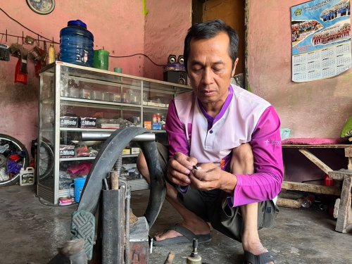 Saat ini, ia bekerja sebagai tukang tambal ban. Sudah sekitar 7 tahun ia jalani.Penghasilannya tidak menentu. Dalam sehari, biasanya hanya sekitar 30 sampai 50 ribu. Bahkan pernah hanya mendapat 5 sampai 10 ribu. Pernah juga dalam sebulan hanya terkumpul 50 ribu.