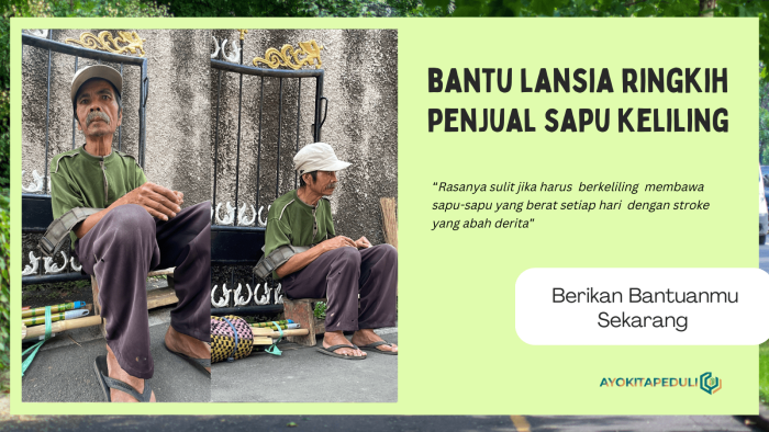 Hasil penjualannya tidak menentu, namun mau bagaimana lagi, beliau harus mengumpulkan dana untuk berobat setiap bulannya. Beliau merupakan pengidap penyakit stroke dan katarak. Sang istri yang hanya berjualan sebagai tukang masak tak bisa banyak membantu.
