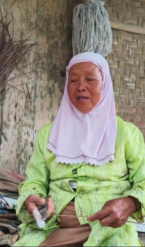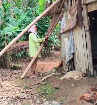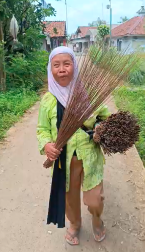 “Sebelum bikin sapu, Mak keliling hutan, cari daun pelepah yang sudah jatuh, nanti dibawa pulang terus dijadikan sapu lidi,” ungkap Mak Enem.
