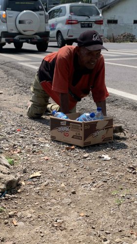 “Bu, pak, mas, mba..air minumnya 3 ribu saja”, ucapnya sambil menatap pengendara yang berlalu lalang. Dari jauh, mungkin orang melihat mbah Reso berjualan sambil duduk di tanah. Tetapi ketika didekati, orang-orang akan kaget karena kakinya hanya sampai paha!