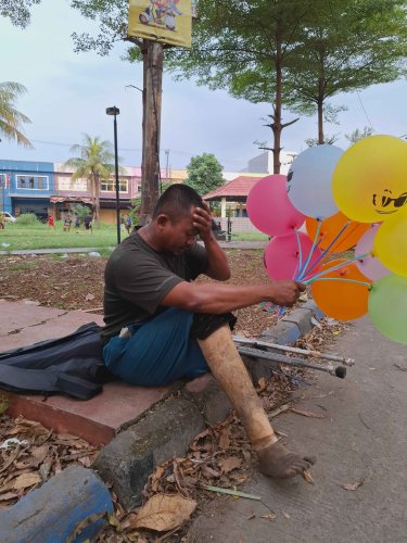 Kini, penghasilan dari jualan balon nyaris tidak cukup untuk kebutuhan sehari-hari. Namun beliau tidak menyerah. Pak Rodi punya impian sederhana: ingin punya usaha kecil membuat kerajinan bunga dari limbah plastik agar bisa tetap berkarya tanpa harus berkeliling di jalan dengan tongkat.