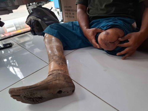 Tujuh tahun lalu, beliau mengalami kecelakaan kerja di proyek pabrik yang membuat kedua kakinya harus diamputasi. Kini, beliau berjalan dengan satu kaki palsu dan dua tongkat, karena kaki palsu satunya hilang jatuh di jalan. Tongkatnya pun sudah licin karena karetnya habis, membuat beliau sering terjatuh.