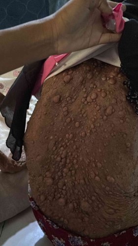 Benjolan-benjolan di tubuh Emak sudah ada sejak Emak kecil. Awalnya hanya ada benjolan di bagian kaki dan sudah dioperasi. Namun setelah itu seiring berjalannya waktu benjolannya semakin banyak dan menyebar ke seluruh tubuh bahkan ada beberapa benjolan yg semakin membesar.