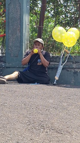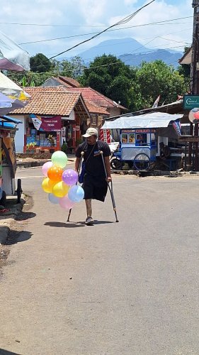 Rodi Nurhayadin (44) kehilangan kedua kakinya setelah kecelakaan kerja pada 2018. Sejak itu, ia bertahan hidup dengan berjualan balon keliling, menempuh jarak hingga 40 km pulang-pergi setiap hari, hanya untuk membawa pulang Rp40.000–Rp60.000.
