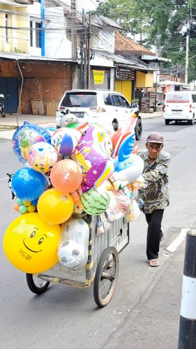 Setiap hari Abah berkeliling menjual balon dari jam 8 pagi sampai sore dengan berjalan kaki menempuk jarak berkilo-kilometer sambil mendorong gerobaknya, berharap ada yang membeli balonnya.