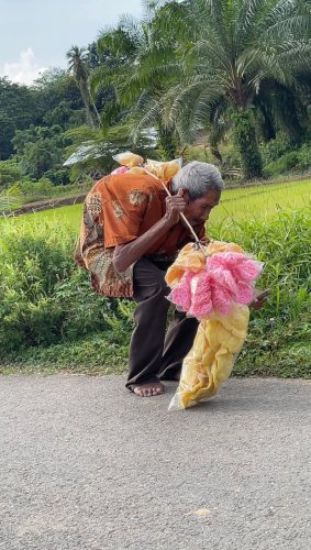 Di bawah teriknya matahari, langkah kaki seorang kakek renta tampak tertatih di pinggir jalan. Tongkat kayu menjadi penopang, sementara kakinya yang telanjang menginjak aspal panas. Itulah Kakek Hamid Puteh (90 tahun)
